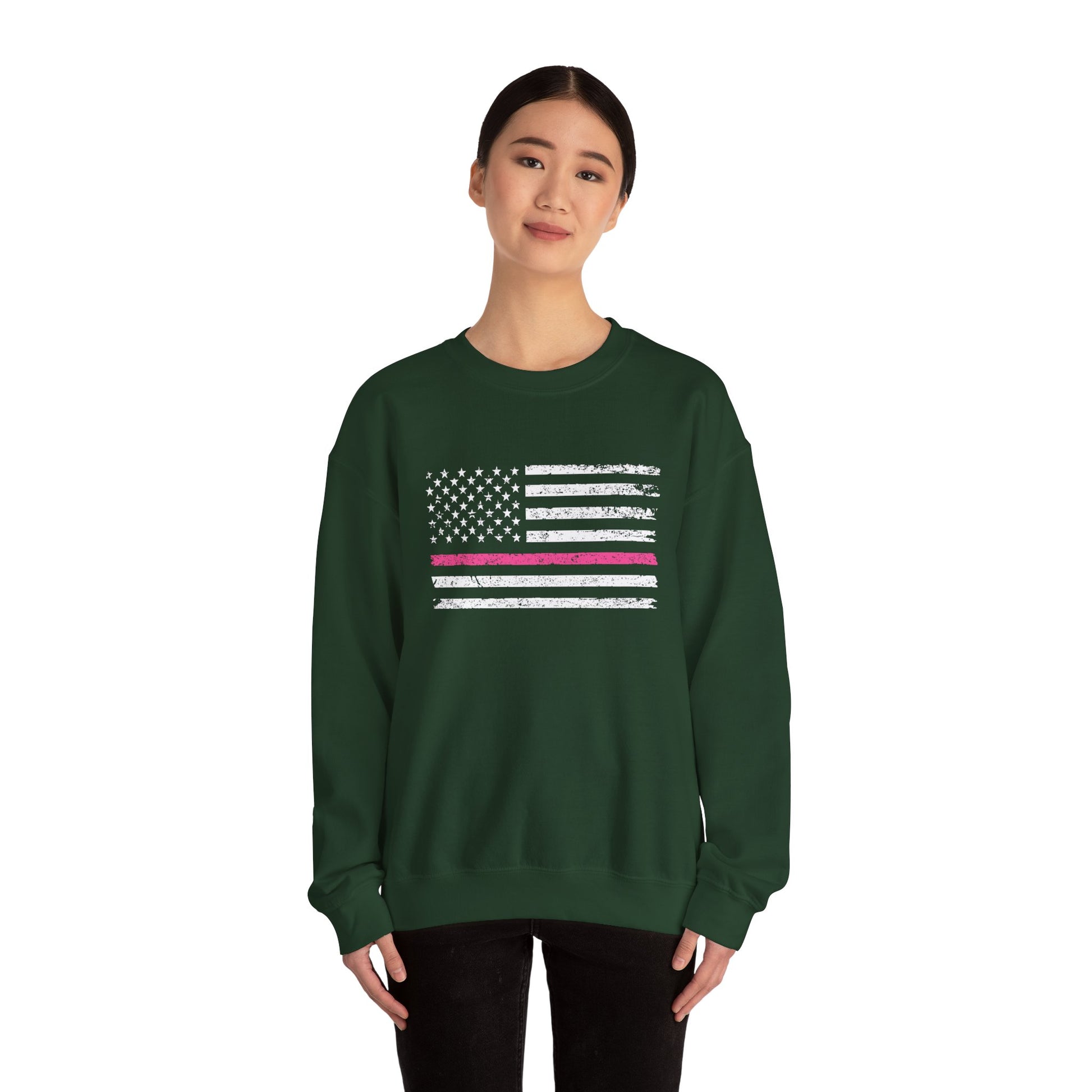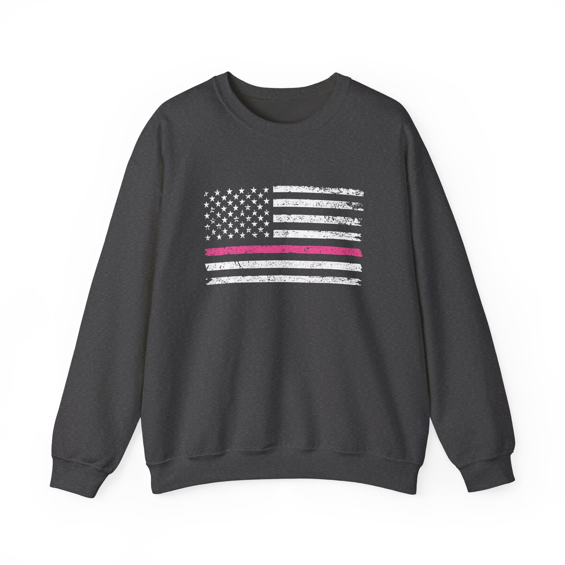A pink line on an American flag T-shirt symbolizing support for breast cancer awareness and solidarity with those affected by the disease. Versatile style suitable for various occasions throughout the year. Relevant to adults and those looking to show their support during breast cancer awareness month.